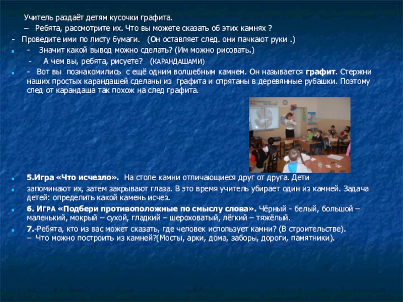 - Вот вы познакомились с ещё одним волшебным камнем. Он называется графит. Стержни наших простых карандашей сделаны из графита и спрятаны в деревянные рубашки. Поэтому след от карандаша так похож на след графита.
