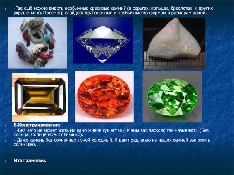 и других украшениях). Просмотр слайдов: драгоценные и необычные по формам и размерам камни.