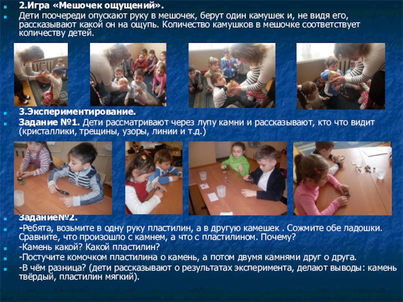 и, не видя его, рассказывают какой он на ощупь. Количество камушков в мешочке соответствует количеству детей.