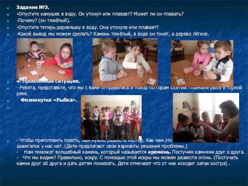 - Чтобы приготовить поесть, нам нужно развести костёр. Как нам это сделать? Ведь ни спичек, ни зажигалок у нас нет. (Дети предлагают свои варианты решения проблемы.) - Нам поможет волшебный камень, который называется кремень. Постучим камнями друг о друга. - Что мы видим? Правильно, искру. С помощью этой искры мы можем развести огонь. (Постучать камни друг об друга и дать детям понюхать. Дети отмечают что от них исходит запах костра) .