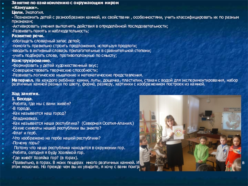 Материал. На каждого ребёнка: камни, лупы, дощечка, пластилин, стакан с водой для экспериментирования, набор различных камней разных по цвету, форме, размеру, картинки с изображением построек из камней.
