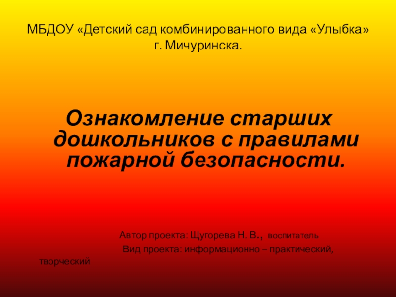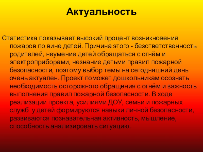 - безответственность родителей, неумение детей обращаться с огнём и электроприборами, незнание детьми правил пожарной безопасности, поэтому выбор темы на сегодняшний день очень актуален. Проект поможет дошкольникам осознать необходимость осторожного обращения с огнём и важность выполнения правил пожарной безопасности. В ходе реализации проекта, усилиями ДОУ, семьи и пожарных служб у детей формируются навыки личной безопасности, развиваются познавательная активность, мышление, способность анализировать ситуацию.