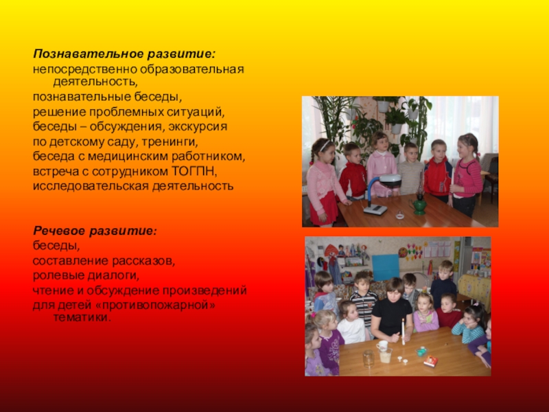 -элементарные навыки адекватного поведения при возникновении пожара: развивать