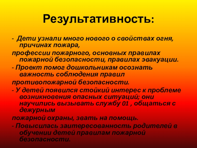 - У детей появился стойкий интерес к проблеме возникновения опасных ситуаций; они научились вызывать службу 01 , общаться с дежурным