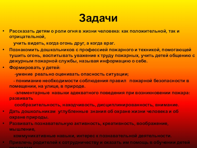 Познакомить дошкольников с профессией пожарного и техникой, помогающей тушить огонь, воспитывать уважение к труду пожарных, учить детей общению с дежурным пожарной службы, называя информацию о себе.
