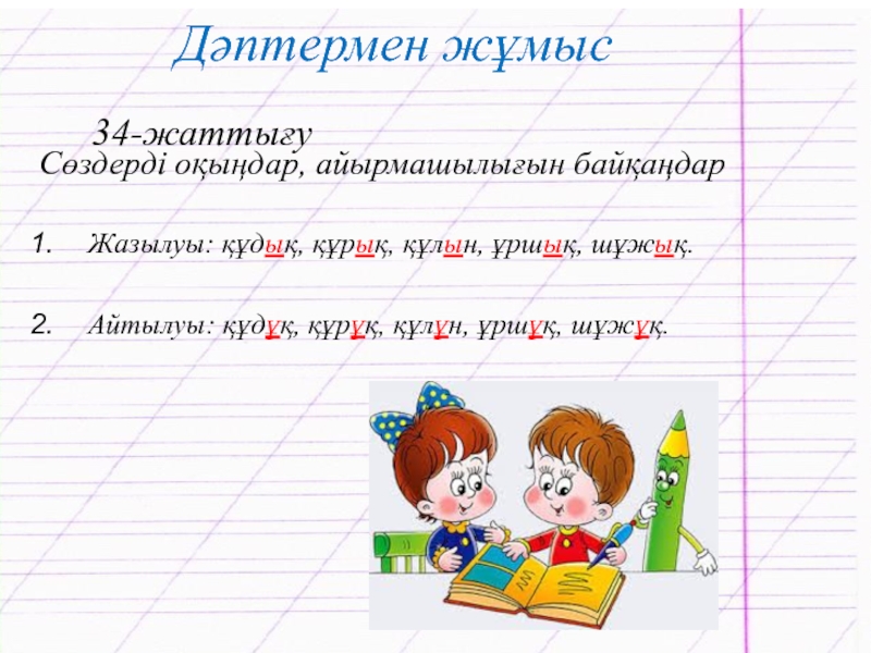 Дәптермен жұмыс34-жаттығуСөздерді оқыңдар, айырмашылығын байқаңдарЖазылуы: құдық, құрық, құлын, ұршық, шұжық.Айтылуы: құдұқ, құрұқ, құлұн, ұршұқ, шұжұқ.