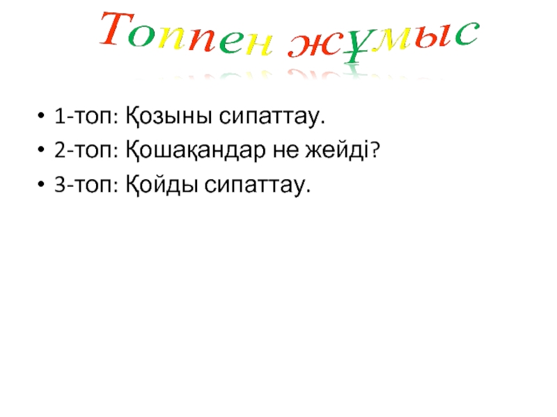 1-топ: Қозыны сипаттау.2-топ: Қошақандар не жейді?3-топ: Қойды сипаттау.