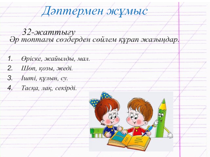 Дәптермен жұмыс32-жаттығуӘр топтағы сөздерден сөйлем құрап жазыңдар.Өріске, жайылды, мал.Шөп, қозы, жеді.Ішті, құлын, су.Тасқа, лақ, секірді.