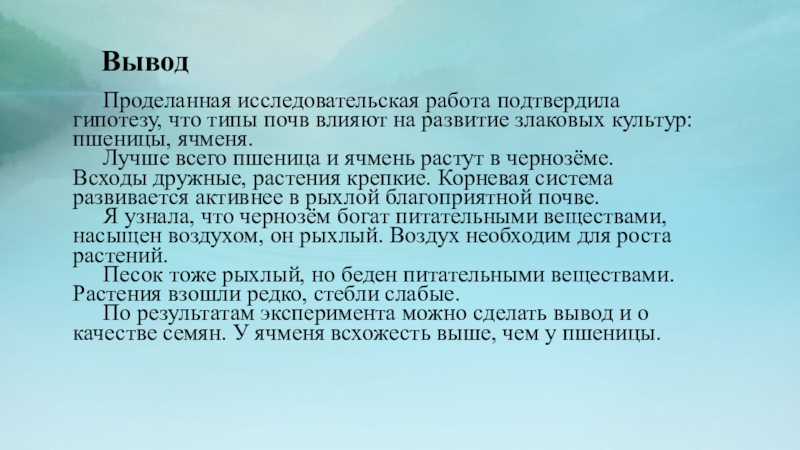 заложить опыт и провести наблюдения за развитием пшеницы, ячменя в различных типах почв;