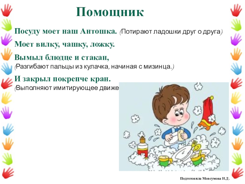Посуду моет наш Антошка. (Потирают ладошки друг о друга)