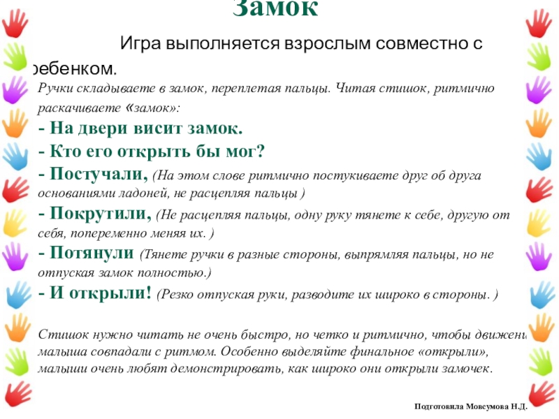 Стишок нужно читать не очень быстро, но четко и ритмично, чтобы движения малыша совпадали с ритмом. Особенно выделяйте финальное «открыли», малыши очень любят демонстрировать, как широко они открыли замочек.
