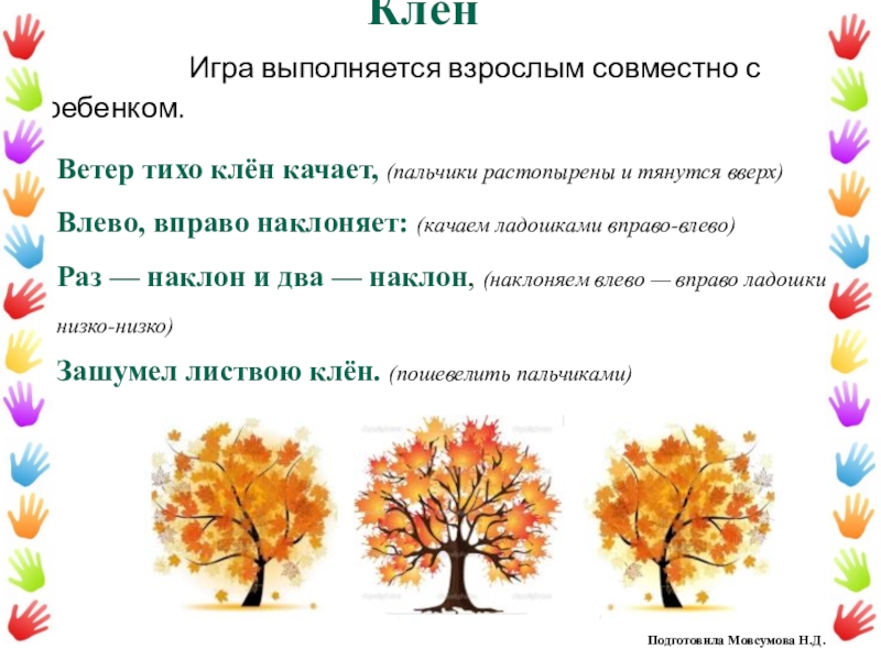 Ветер тихо клён качает, (пальчики растопырены и тянутся вверх)