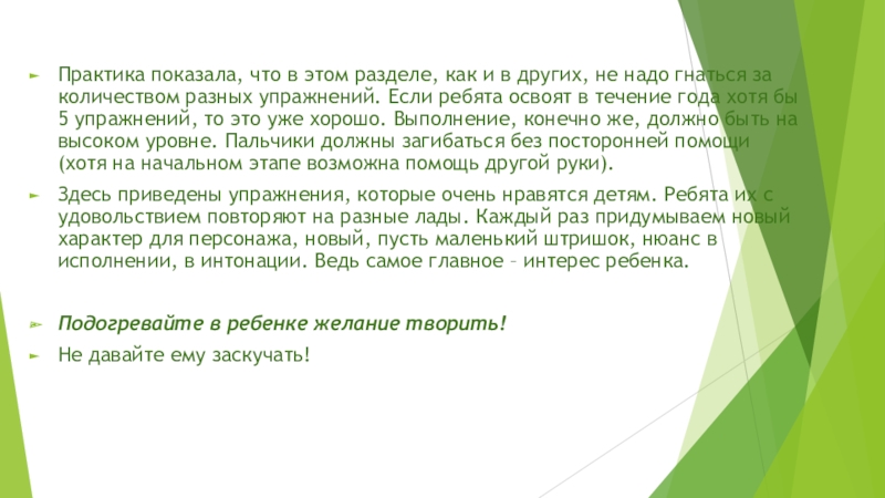 надо гнаться за количеством разных упражнений. Если ребята освоят в течение года хотя бы 5 упражнений, то это уже хорошо. Выполнение, конечно же, должно быть на высоком уровне. Пальчики должны загибаться без посторонней помощи (хотя на начальном этапе возможна помощь другой руки).