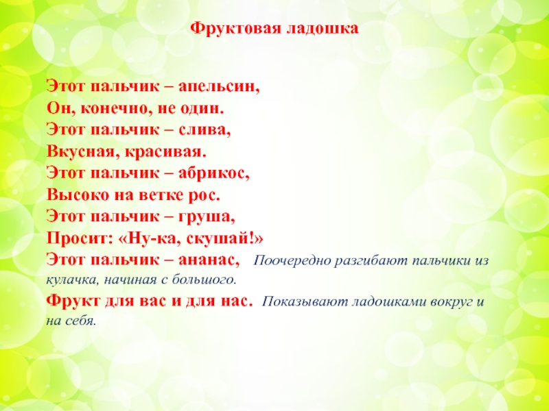 Фруктовая ладошка Этот пальчик – апельсин,Он, конечно, не один.Этот пальчик – слива,Вкусная, красивая.Этот пальчик – абрикос,Высоко на ветке рос.Этот пальчик –