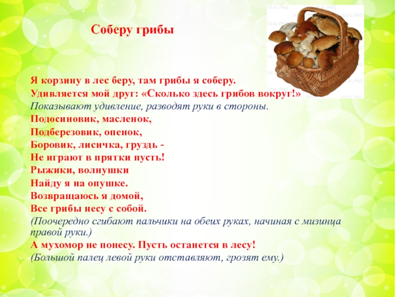 Соберу грибы Я корзину в лес беру, там грибы я соберу.Удивляется мой друг: «Сколько здесь грибов вокруг!»Показывают удивление,