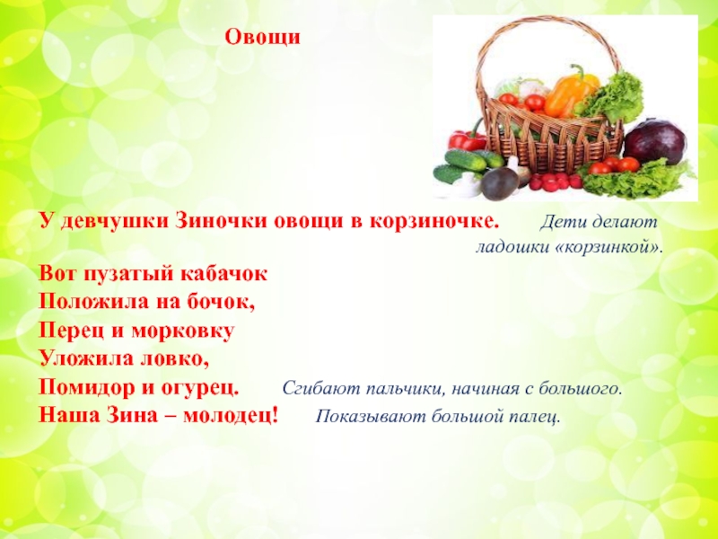 Овощи У девчушки Зиночки овощи в корзиночке.    Дети делают