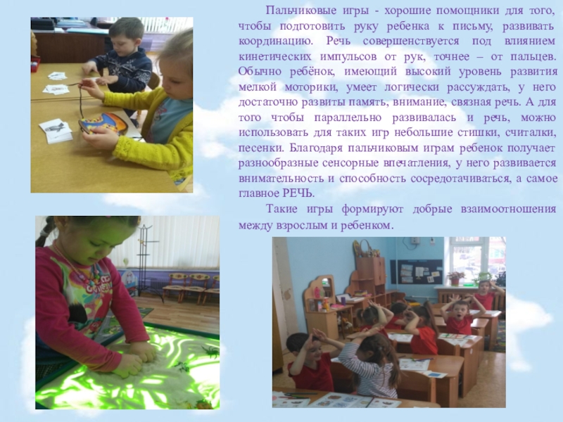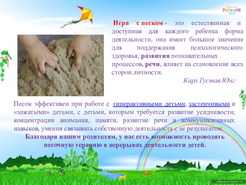 Игра с песком - это естественная и доступная для каждого ребенка форма деятельности, она имеет большое значение для поддержания психологического здоровья, развития познавательных процессов, речи, влияет на становление всех сторон личности.