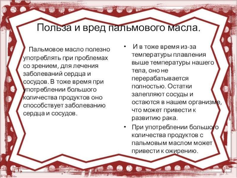При употреблении большого количества продуктов с пальмовым маслом может привести к ожирению.
