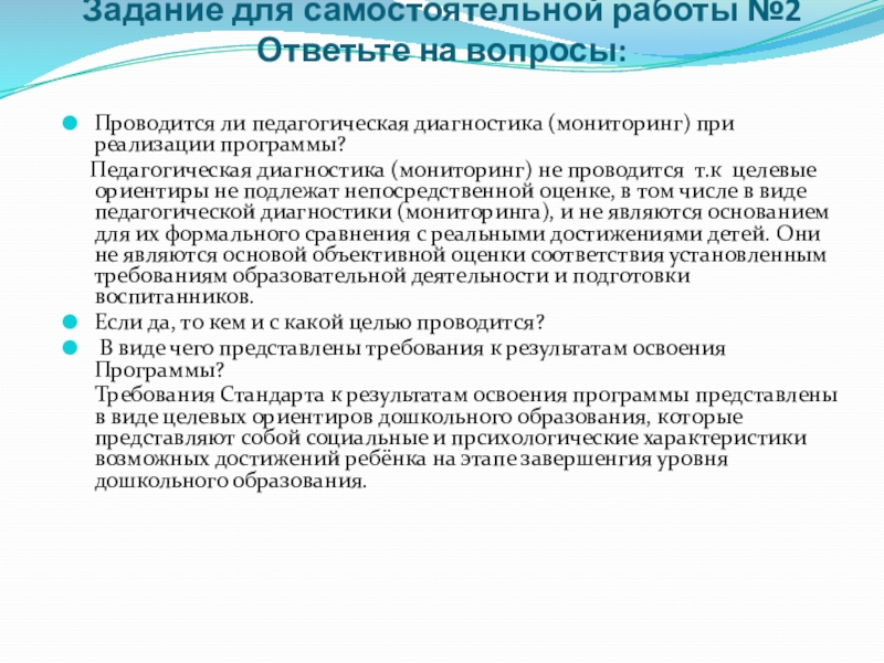 Требования Стандарта к результатам освоения программы представлены в виде целевых ориентиров дошкольного образования, которые представляют собой социальные и прсихологические характеристики возможных достижений ребёнка на этапе завершенгия уровня дошкольного образования.