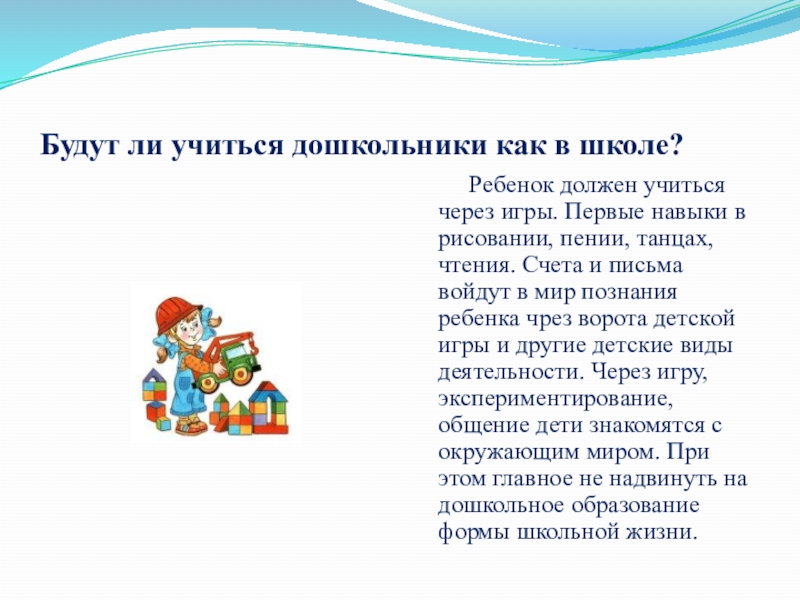 Слайд 15Будут ли учиться дошкольники как в школе?