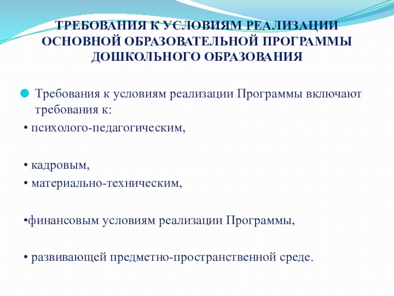 Слайд 11ТРЕБОВАНИЯ К УСЛОВИЯМ РЕАЛИЗАЦИИ ОСНОВНОЙ ОБРАЗОВАТЕЛЬНОЙ ПРОГРАММЫ ДОШКОЛЬНОГО ОБРАЗОВАНИЯ