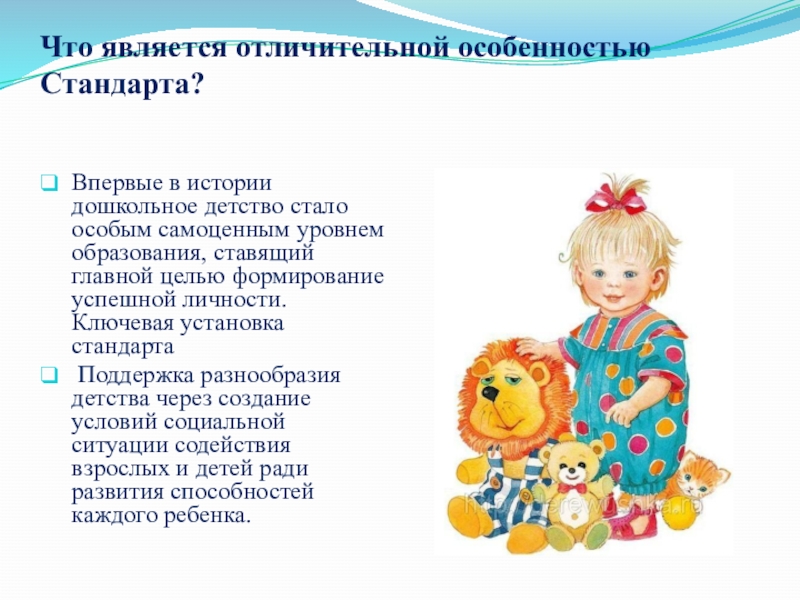 Поддержка разнообразия детства через создание условий социальной ситуации содействия взрослых и детей ради развития способностей каждого ребенка.