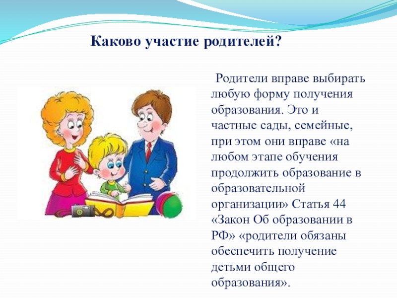 образования. Это и частные сады, семейные, при этом они вправе «на любом этапе обучения продолжить образование в образовательной организации» Статья 44 «Закон Об образовании в РФ» «родители обязаны обеспечить получение детьми общего образования».