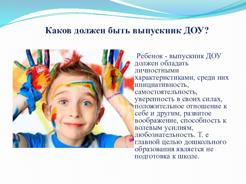 должен обладать личностными характеристиками, среди них инициативность, самостоятельность, уверенность в своих силах, положительное отношение к себе и другим, развитое воображение, способность к волевым усилиям, любознательность. Т. е главной целью дошкольного образования является не подготовка к школе.
