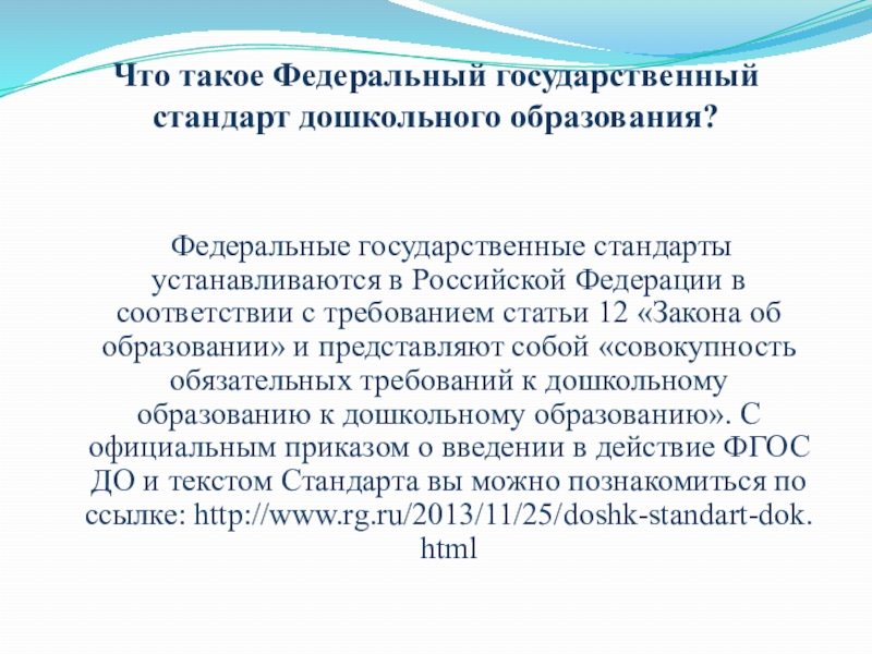 устанавливаются в Российской Федерации в соответствии с требованием статьи 12 «Закона об образовании» и представляют собой «совокупность обязательных требований к дошкольному образованию к дошкольному образованию». С официальным приказом о введении в действие ФГОС ДО и текстом Стандарта вы можно познакомиться по ссылке: http://www.rg.ru/2013/11/25/doshk-standart-dok.html
