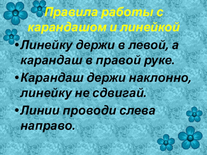 Правила работы с карандашом и линейкойЛинейку держи в левой, а карандаш в правой руке.Карандаш держи наклонно, линейку