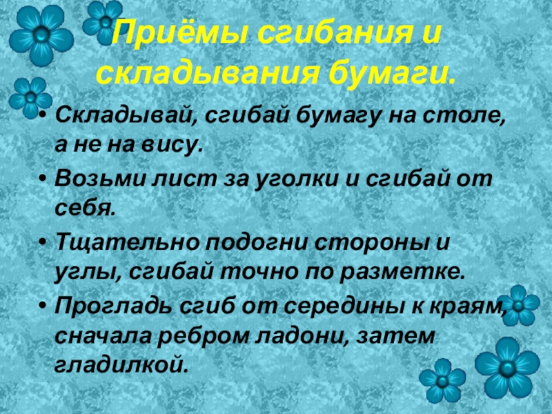 Приёмы сгибания и складывания бумаги.Складывай, сгибай бумагу на столе, а не на вису.Возьми лист за уголки и