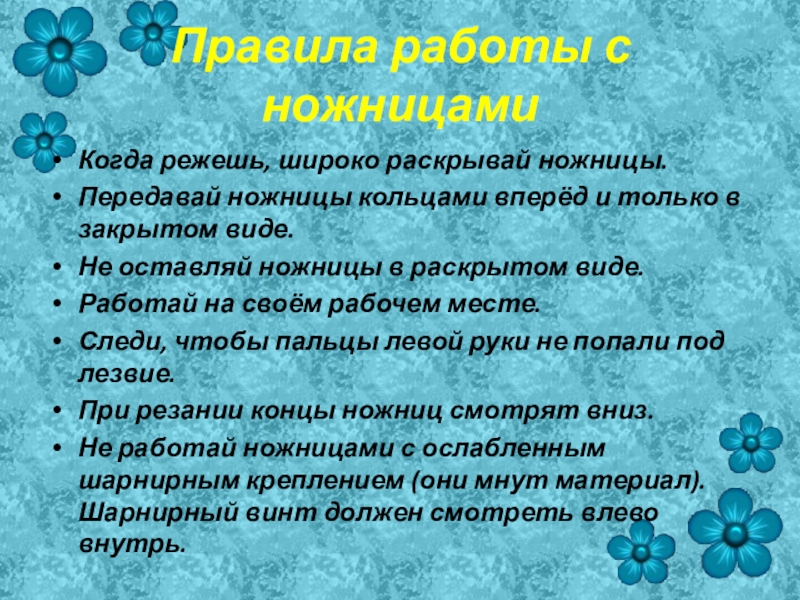 Правила работы с ножницамиКогда режешь, широко раскрывай ножницы.Передавай ножницы кольцами вперёд и только в закрытом виде.Не оставляй