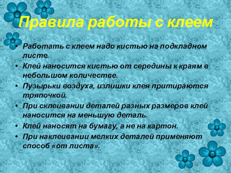 Правила работы с клеемРаботать с клеем надо кистью на подкладном листе.Клей наносится кистью от середины к краям