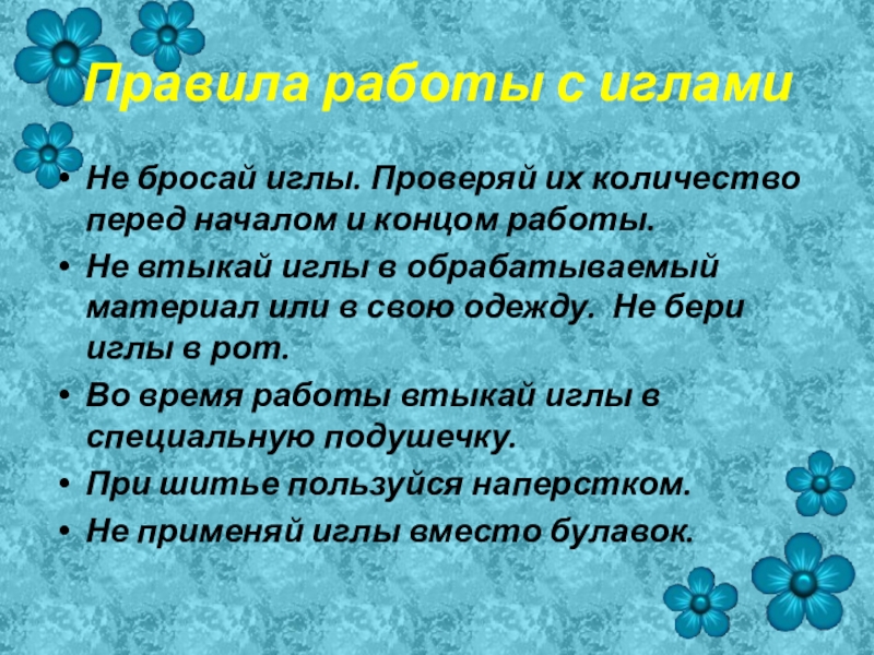 Правила работы с игламиНе бросай иглы. Проверяй их количество перед началом и концом работы.Не втыкай иглы в