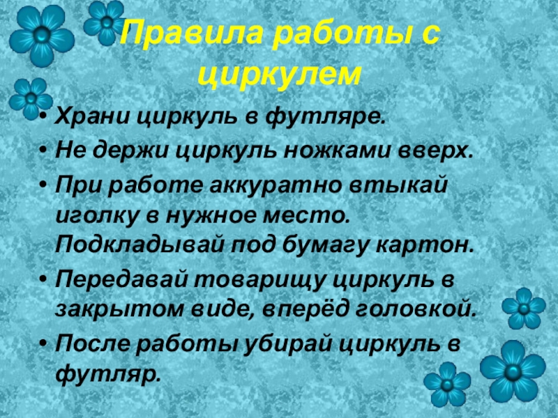 Правила работы с циркулемХрани циркуль в футляре.Не держи циркуль ножками вверх.При работе аккуратно втыкай иголку в нужное