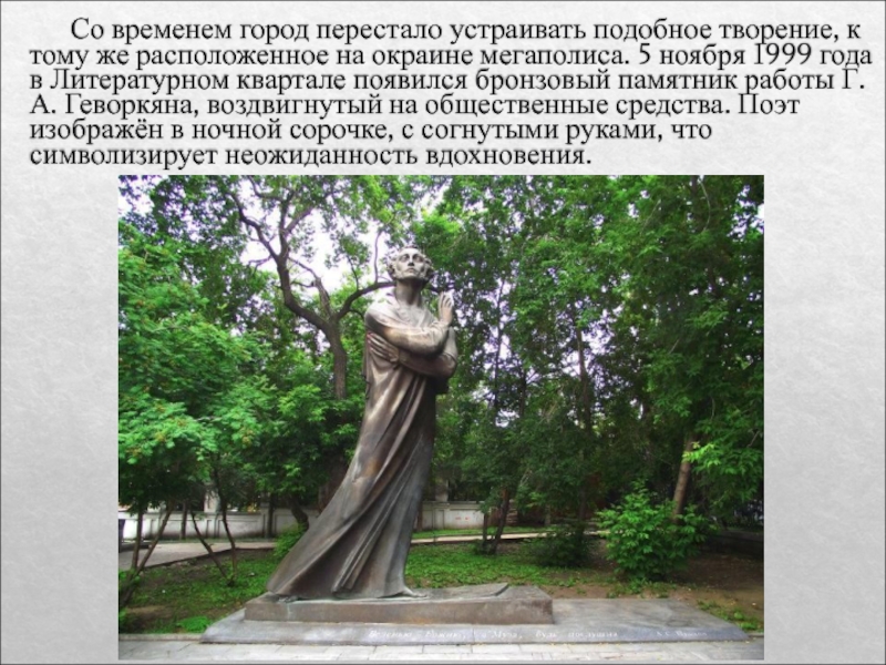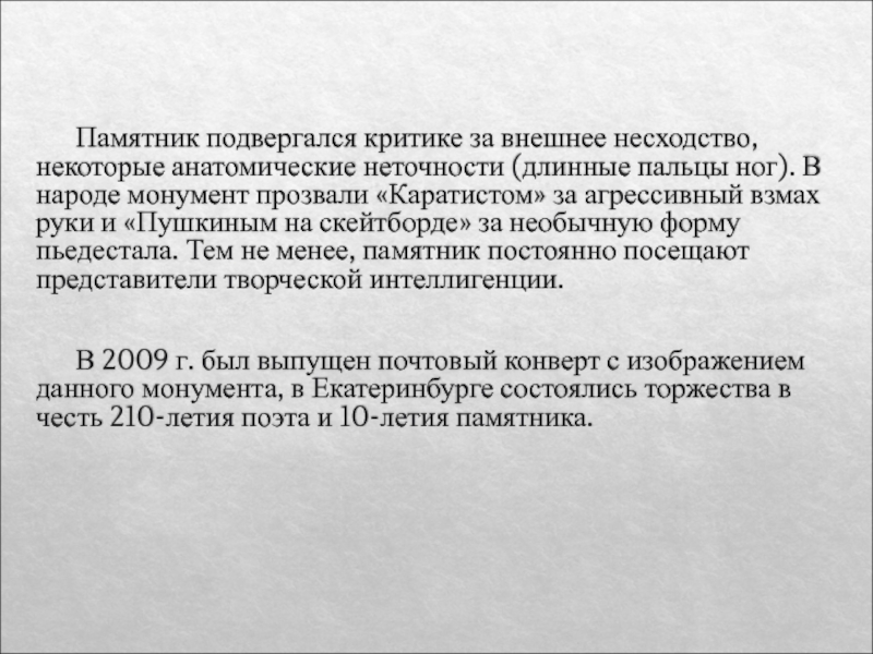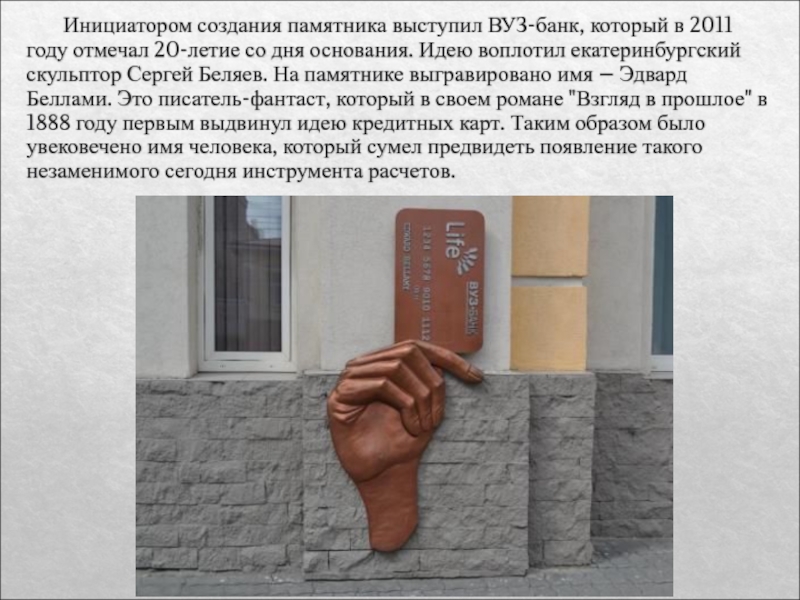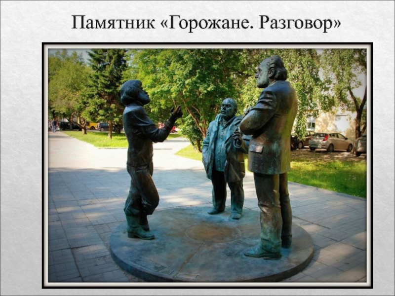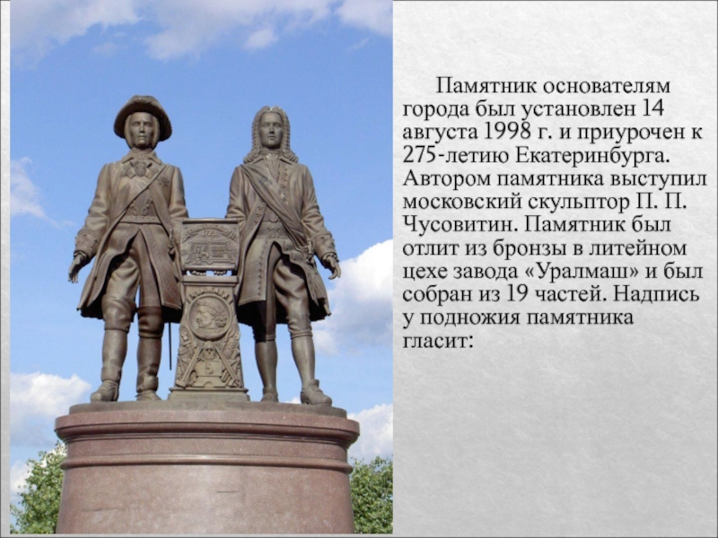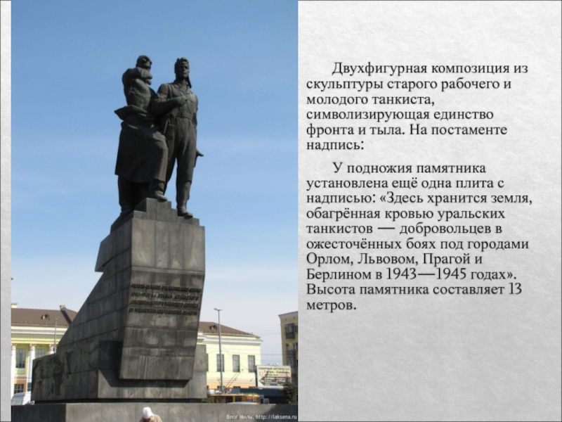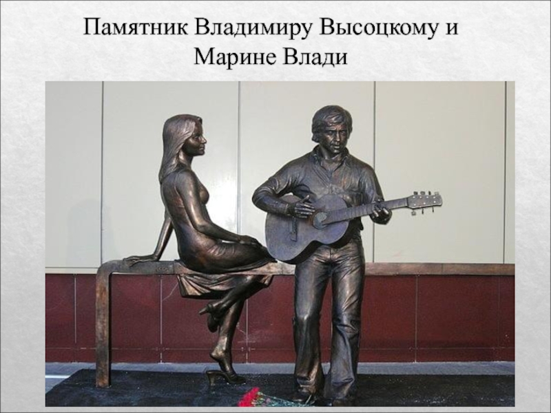 Памятник Владимиру Высоцкому и Марине Влади отлит из бронзы. Фигуры выглядят естественно, так как их пропорции соответствуют человеческим. Владимир играет на гитаре, Марина сидит рядом с ним... Памятник установлен напротив гостиницы «Большой Урал», в ней Высоцкий останавливался во время приездов на гастроли.