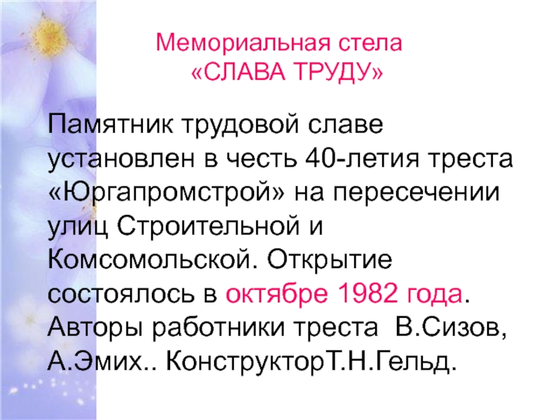 Слайд 20Памятник трудовой славе установлен в честь 40-летия треста «Юргапромстрой» на пересечении