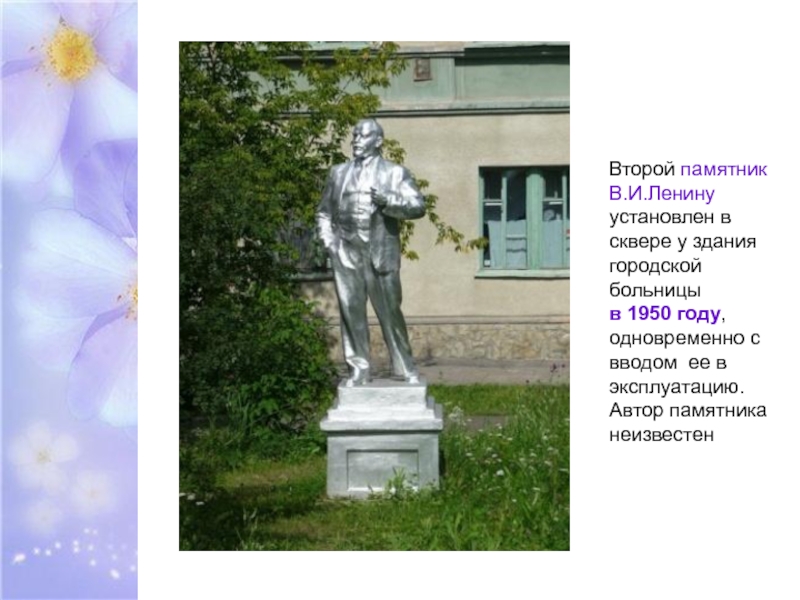 Слайд 5Второй памятник В.И.Ленину установлен в сквере у здания городской больницы