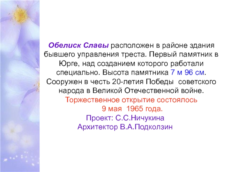 Слайд 7Обелиск Славы расположен в районе здания бывшего управления треста. Первый памятник
