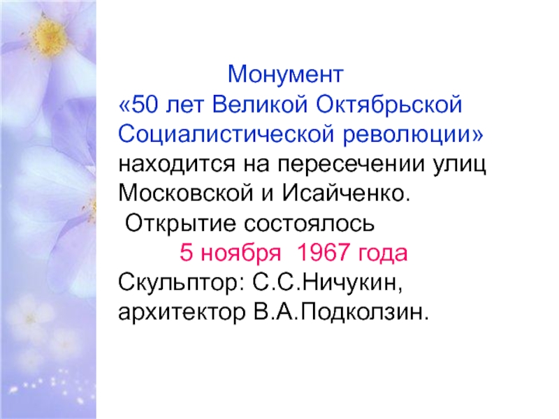 Скульптор: С.С.Ничукин, архитектор В.А.Подколзин.