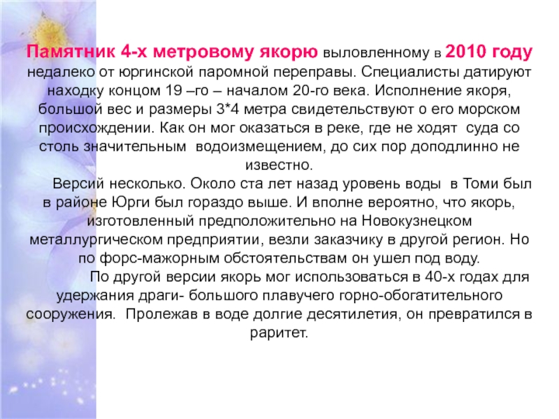 паромной переправы. Специалисты датируют находку концом 19 –го – началом 20-го века. Исполнение якоря, большой вес и размеры 3*4 метра свидетельствуют о его морском происхождении. Как он мог оказаться в реке, где не ходят суда со столь значительным водоизмещением, до сих пор доподлинно не известно.