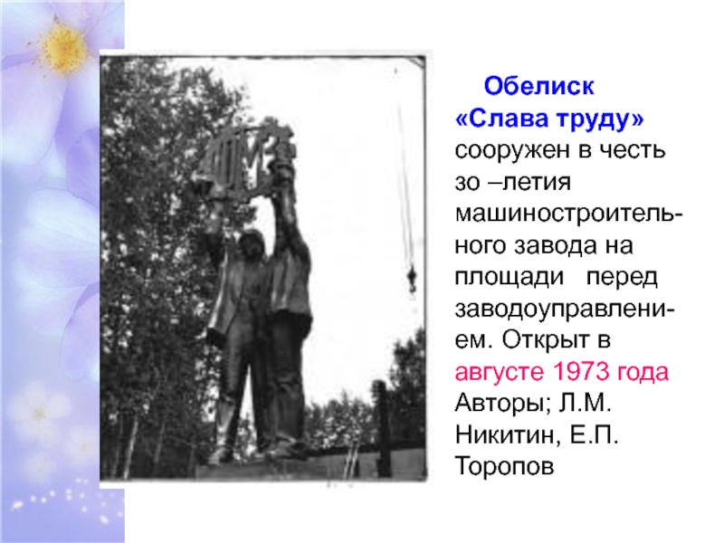 завода на площади перед заводоуправлени-ем. Открыт в августе 1973 года Авторы; Л.М.Никитин, Е.П.Торопов