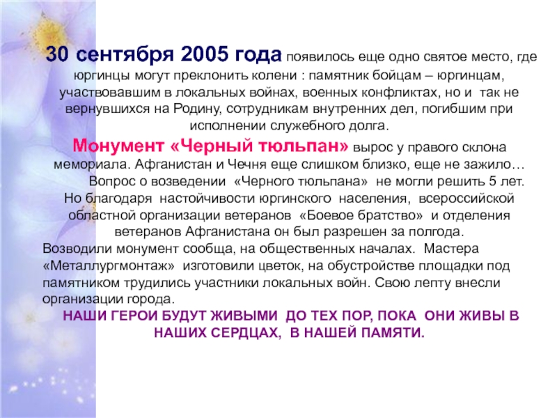 НАШИ ГЕРОИ БУДУТ ЖИВЫМИ ДО ТЕХ ПОР, ПОКА ОНИ ЖИВЫ В НАШИХ СЕРДЦАХ, В НАШЕЙ ПАМЯТИ.
