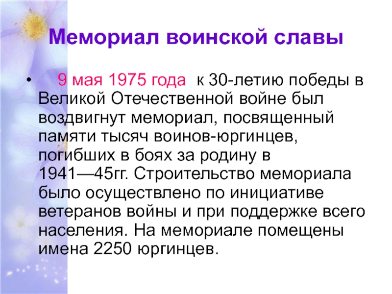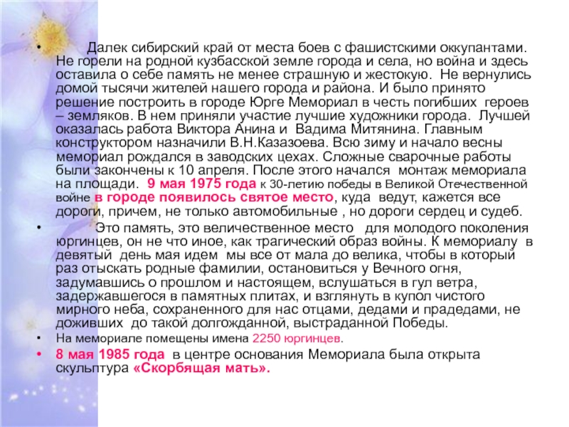 фашистскими оккупантами. Не горели на родной кузбасской земле города и села, но война и здесь оставила о себе память не менее страшную и жестокую. Не вернулись домой тысячи жителей нашего города и района. И было принято решение построить в городе Юрге Мемориал в честь погибших героев – земляков. В нем приняли участие лучшие художники города. Лучшей оказалась работа Виктора Анина и Вадима Митянина. Главным конструктором назначили В.Н.Казазоева. Всю зиму и начало весны мемориал рождался в заводских цехах. Сложные сварочные работы были закончены к 10 апреля. После этого начался монтаж мемориала на площади. 9 мая 1975 года к 30-летию победы в Великой Отечественной войне в городе появилось святое место, куда ведут, кажется все дороги, причем, не только автомобильные , но дороги сердец и судеб.