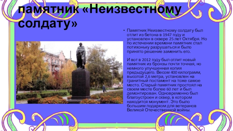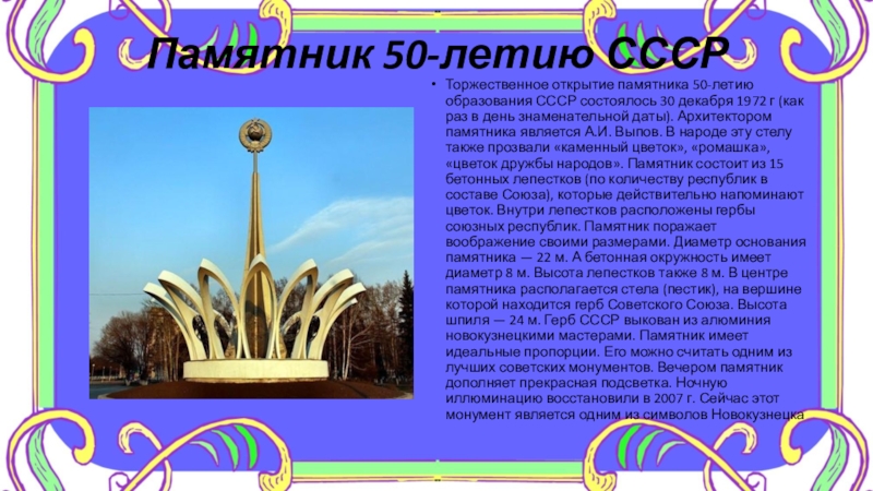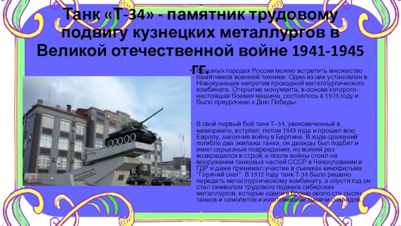 В разных городах России можно встретить множество памятников военной технике. Один из них установлен в Новокузнецке напротив проходной металлургического комбината. Открытие монумента, в основе которого - настоящая боевая машина, состоялось в 1973 году и было приурочено к Дню Победы.