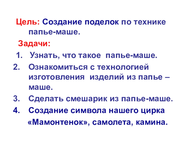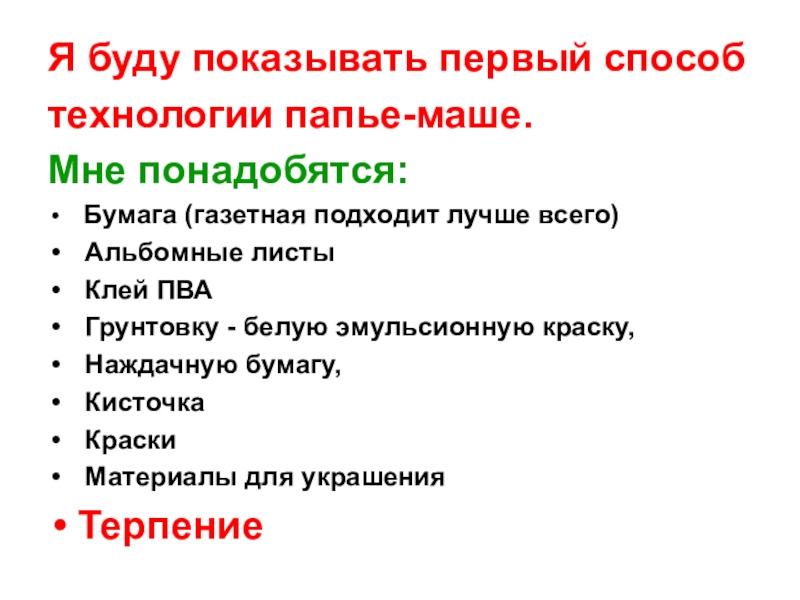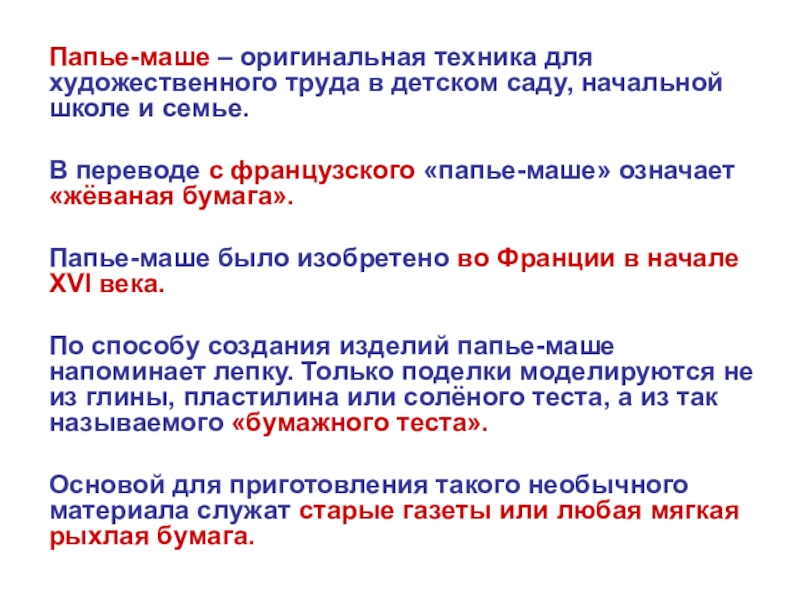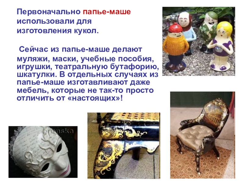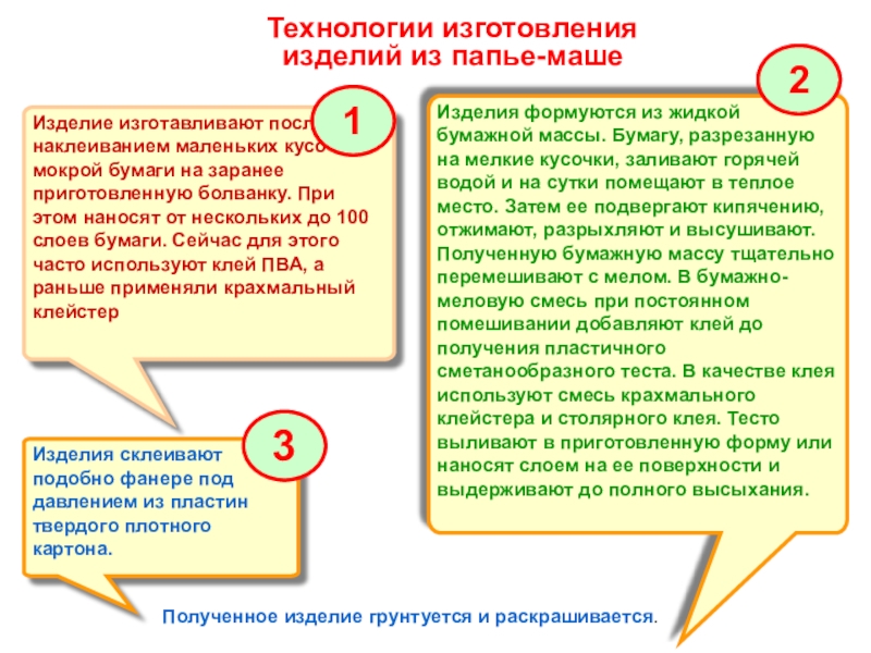 Изделия формуются из жидкой бумажной массы. Бумагу, разрезанную на мелкие кусочки, заливают горячей водой и на сутки помещают в теплое место. Затем ее подвергают кипячению, отжимают, разрыхляют и высушивают. Полученную бумажную массу тщательно перемешивают с мелом. В бумажно-меловую смесь при постоянном помешивании добавляют клей до получения пластичного сметанообразного теста. В качестве клея используют смесь крахмального клейстера и столярного клея. Тесто выливают в приготовленную форму или наносят слоем на ее поверхности и выдерживают до полного высыхания.