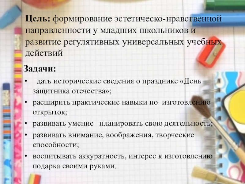 воспитывать аккуратность, интерес к изготовлению подарка своими руками.