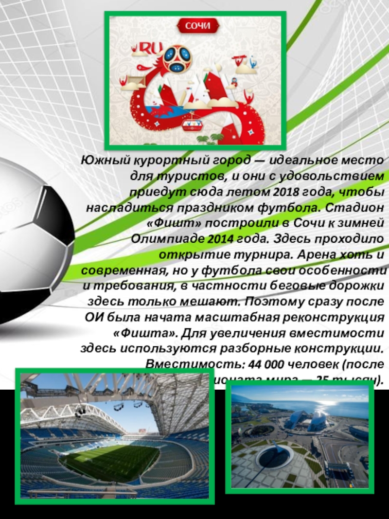 удовольствием приедут сюда летом 2018 года, чтобы насладиться праздником футбола. Стадион «Фишт» построили в Сочи к зимней Олимпиаде 2014 года. Здесь проходило открытие турнира. Арена хоть и современная, но у футбола свои особенности и требования, в частности беговые дорожки здесь только мешают. Поэтому сразу после ОИ была начата масштабная реконструкция «Фишта». Для увеличения вместимости здесь используются разборные конструкции. Вместимость: 44 000 человек (после Чемпионата мира — 25 тысяч).