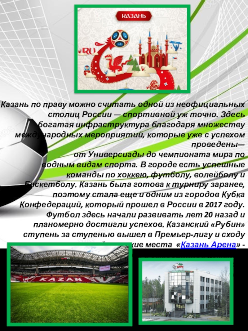 Баскетболу. Казань была готова к турниру заранее, поэтому стала еще и одним из городов Кубка Конфедераций, который прошел в России в 2017 году. Футбол здесь начали развивать лет 20 назад и планомерно достигли успехов. Казанский «Рубин» ступень за ступенью вышел в Премьер-лигу и сходу стал занимать в ней высокие места «Казань Арена» - достойный «дом» для славной и самобытной команды. Вместимость: