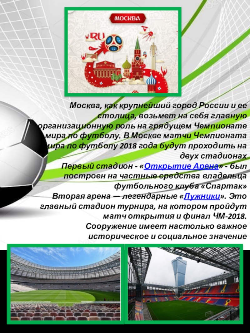 главную организационную роль на грядущем Чемпионате мира по футболу. В Москве матчи Чемпионата мира по футболу 2018 года будут проходить на двух стадионах